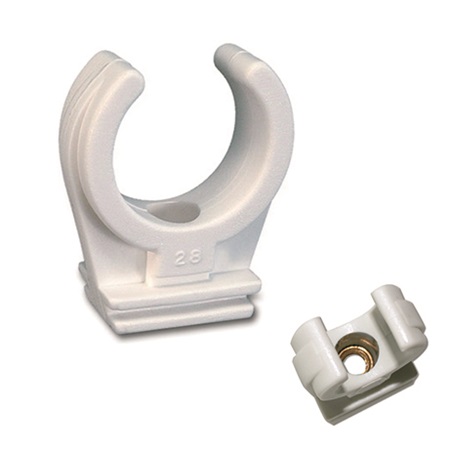 Características: Elevada resistencia térmica (-40º C/+80º C). Su elevada tenacidad y capacidad de retención, permiten una instalación fácil y segura, con una simple presión sobre el tubo (clic). Posibilidades de fijación con tirafondos M-6, tacos y tornillos tradicionales, tacos clavo y guías (dos alturas).